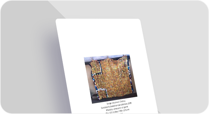 Serge A ttukwei Clottey Success is b ased o n p ersistence , 2 019 Plastics, wires a nd o il paint 78 x 107 inches / 198 x 2 72 c m US$35,000