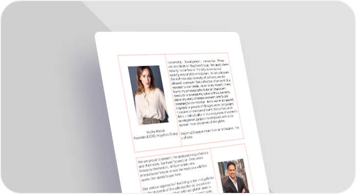 Leadership. Development. Innovation. These are our ideals at Mayshad Group. We apply them equally to our love of the arts as we do our socially responsible enterprises. As we celebrate the richness and diversity of cultures, we are pleased to present this collection of artwork that artist myself, I have represents our ideals. As an found my photography to be an important medium to express my voice without barriers, share my story of empowerment, and build meaningful connection. Art is vast in its appeal; it speaks to people of all ages, races, languages. It evokes an emotional bond that unites us all. Art is a critical pillar of our ecosystem of women’s development projects to empower and unite women from all corners of the globe. Nezha Alaoui Founder & CEO, Mayshad Group Mayshad Group is more than an enterprise. It is a choice. We are proud to present the enclosed array of artists and their work. We have focused on three areas: Morocco-themed art, African artists, and international female artists. We hope you will find works that speak to you here. Our unique approach of involving artists and galleries us to curate an in the proceeds of the sale enables auction. We have worked with our global team to identify the artists contained herein. In each case, they have met two of the following three criteria that lead to long-term appreciation of value in the art market: (1) they are academically trained from a leading institution, (2) they have representation from an established gallery, and/or (3) they have been acquired by leading collections. Aseem Giri Art Advisor, Mayshad Every purchase furthers the Mayshad mission in a Group meaningful way. We are excited to partner with these artists whose ideals align with ours.