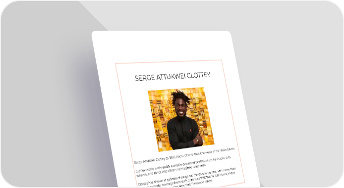 SERGE ATTUKWEI CLOTTEY Serge Attukwei Clottey (b. 1985, Accra, Ghana) lives and works in his native Ghana. Clottey works with readily available discarded plastics which he shapes, cuts, weaves, and binds into vibrant reimagined sculptures. Clottey has shown at galleries throughout the US and Europe. He has received age from such outlets as BBC World, BBC News, Vogue extensive media cover Magazine, The Guardian, The New York Times and others.