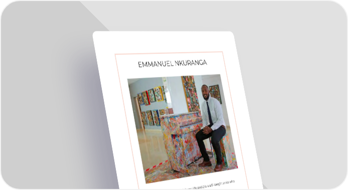 EMMANUEL NKURANGA Emmanuel Nkuranga (b. 1987, Mityana,Uganda) is a self-taught artist who re-located to his native Rwanda. Emmanuel is a mixed-media expressionist whose practice relies upon deploying multiple color schematics on the same base of expression - be it a piano, a car or a canvas. is a part of several private and Emmanuel has exhibited throughout the world and corporate collections. He is also the Co-Founder of Inema Arts Center in Kigali, Rwanda which identiļ¬es and celebrates emerging artistic talent from Rwanda.